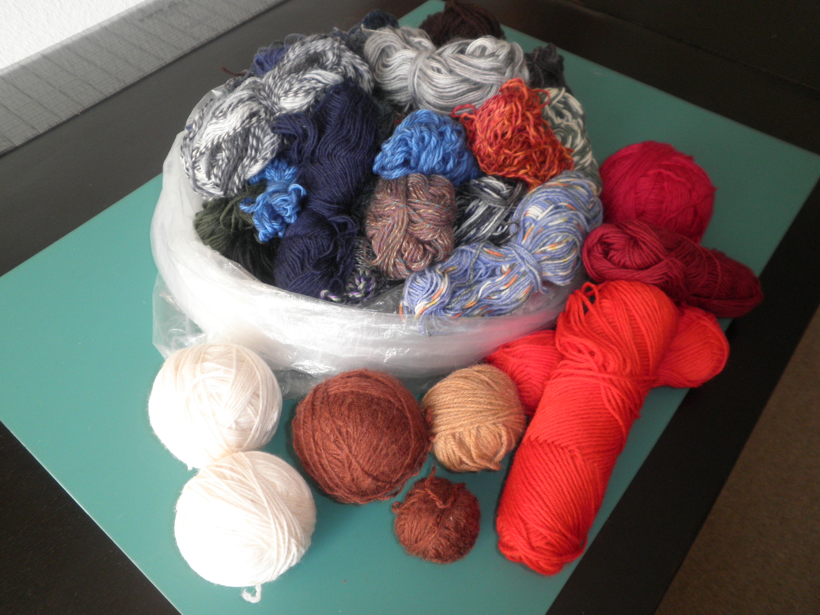 Meine Schwiegermutter strickt gerne Socken. Kürzlich gab sie mir einen Sack mit Wollresten. Die Wolle ist ziemlich dunkel aber zum Glück habe ich noch rote, hellbraune und weisse Wollreste, die ich mit verwenden kann. Bin gespannt, was ich daraus machen werde.
