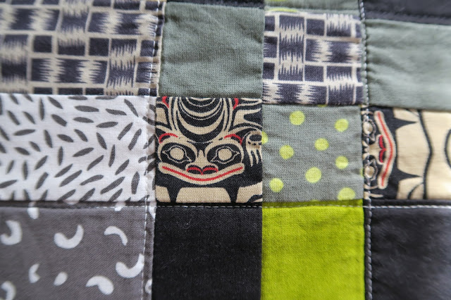 Spent the last week working on this quilt and I'm almost done quilting it. Had a bit a hard time deciding on the quilting pattern and finally chose to echo quilt the log cabins and add straight lines to the top and bottom part. Will probably add some hand quilting touches to the fire places in the cabins.